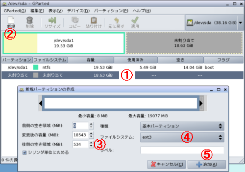 ファイルシステムを4『ext3』に設定します。最後に5追加ボタンを押してください。ext3はLinuxのファイルシステムの形式です。