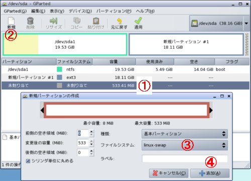 新規パーティションの作成というダイアログボックスが出るので、ファイルシステムを3『linux-swap』を選んで4追加ボタンを押してください。
