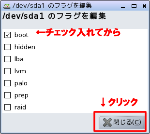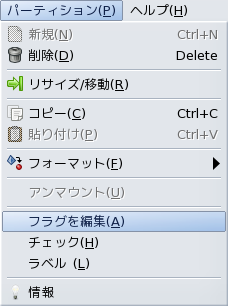上図の赤い線にはbootという記述がありますが、フラグという欄にどこにもbootという表示がなければ、ext3形式の新規パーティションを選択して、